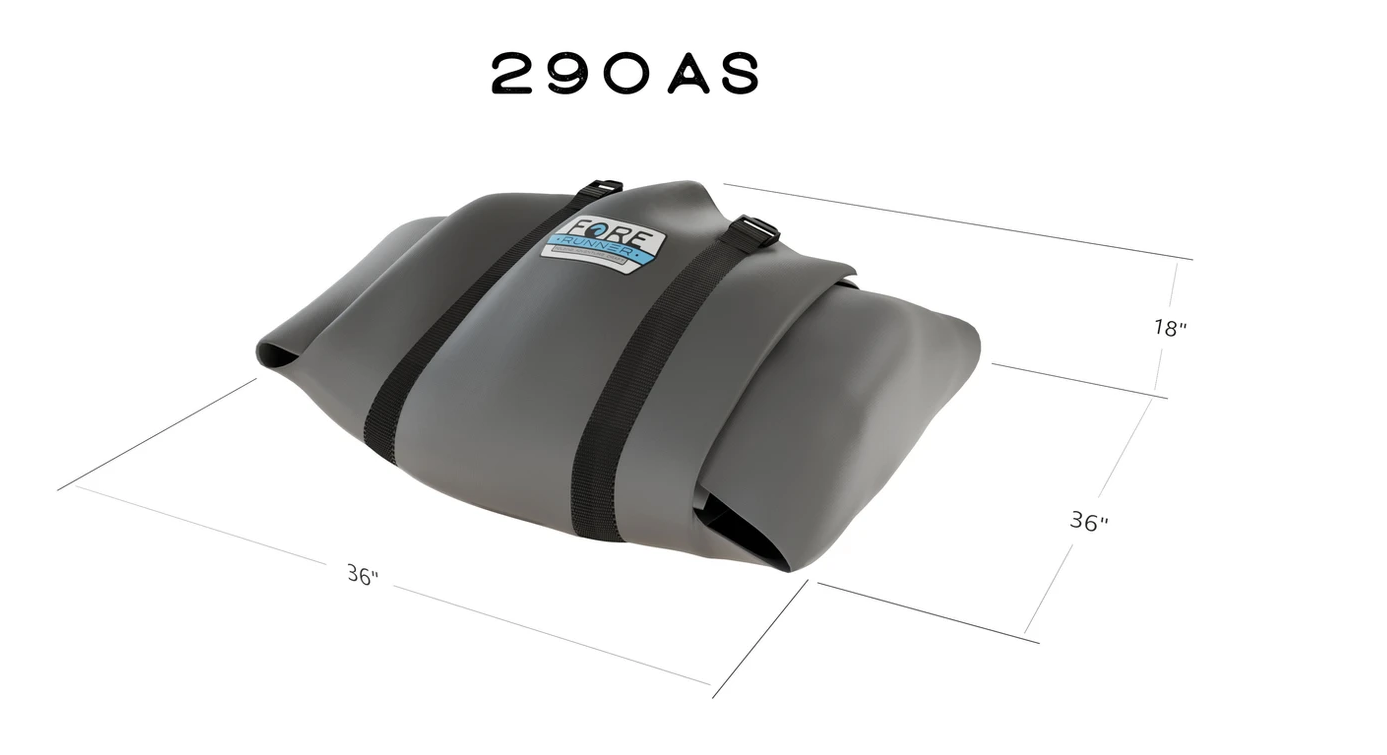 With the installed eyebolts in multiple places, the 340 can be quickly lifted onto the deck of a boat for storage. The real beauty of this craft is that you get the feel, strength and safety of a standard RIB (rigid inflatable boat) but still have the ability to “make it go away”. In minutes the Fore Runner can go from being an offshore craft to sitting in the provided weather-proof travel bag.
