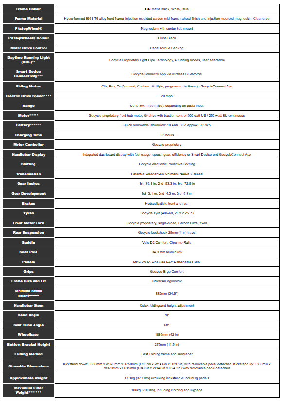 Gocycle G4i is powered by the all-new G4drive™ electric motor. The G4drive™ provides a smooth and quiet ride, while delivering more torque and low-speed start capability – all within a class-leading compact package. The proprietary G4drive™ and gearbox has been in development for a number of years and subject to many, many test miles at Gocycle’s research and development facility to ensure it performs to the G4i’s high standards of reliability.