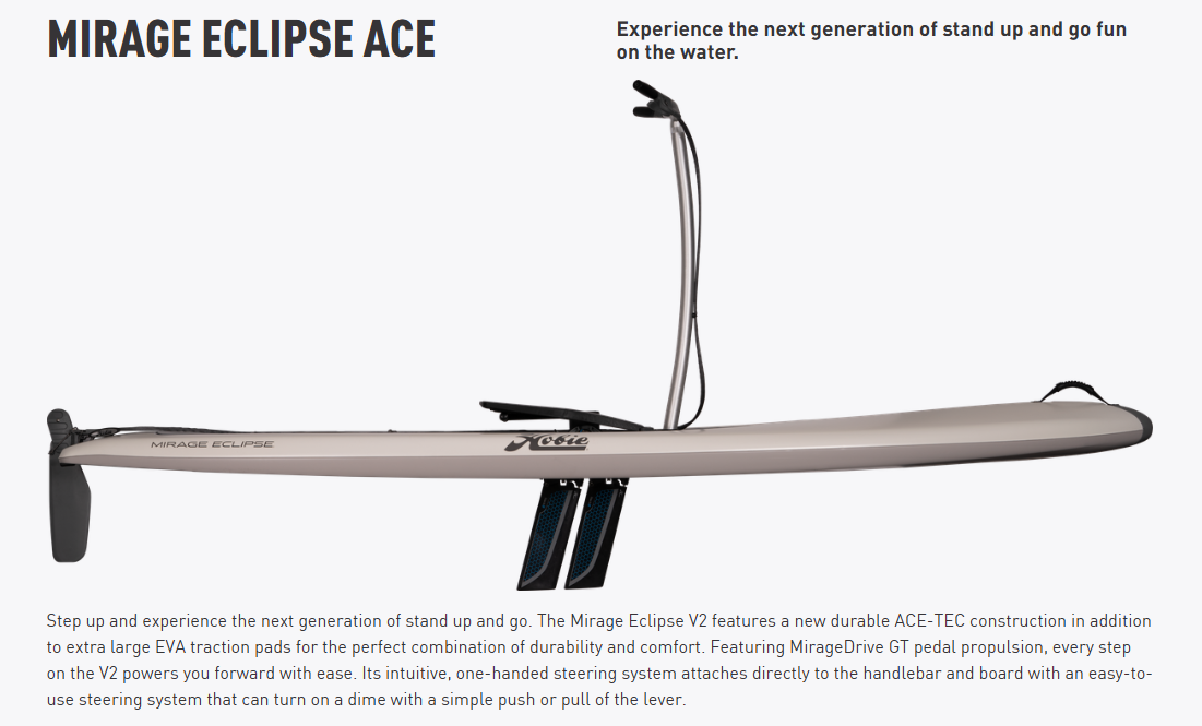 The Hobie Mirage Eclipse Ace Pedalboard is the next generation of stand-up-and-go! Hobie has taken this "Stand Up Pedalboard" to the next level by adding the Hobie MirageDrive GT. Glide across the water effortlessly as you pedal with a simple stepping motion. This efficient MirageDrive GT provides a fun and effective workout. The rudder control is attached to the adjustable handlebar, offering complete control at your fingertips. Steering is intuitive - squeeze the left handle to go left and the right handle to go right. It's easy to adjust the tension for smooth operation. Enjoy fun and fitness for the whole family.