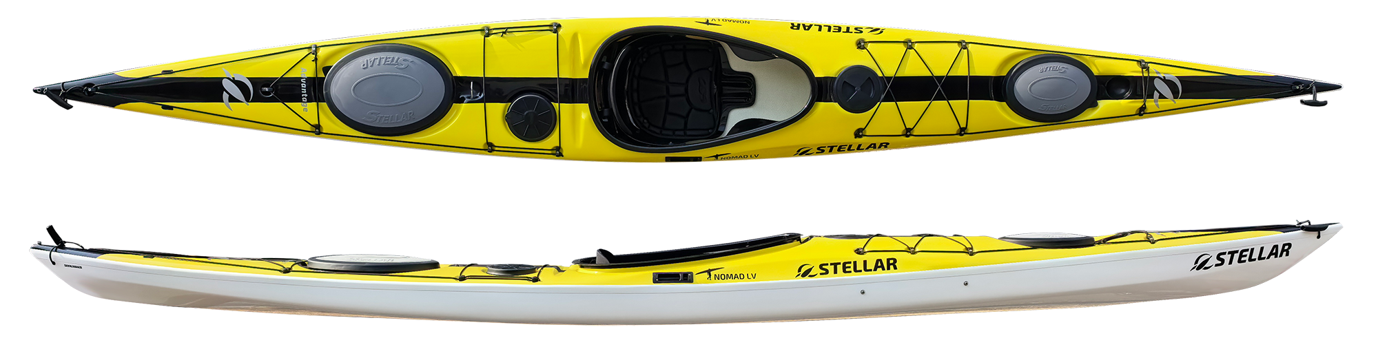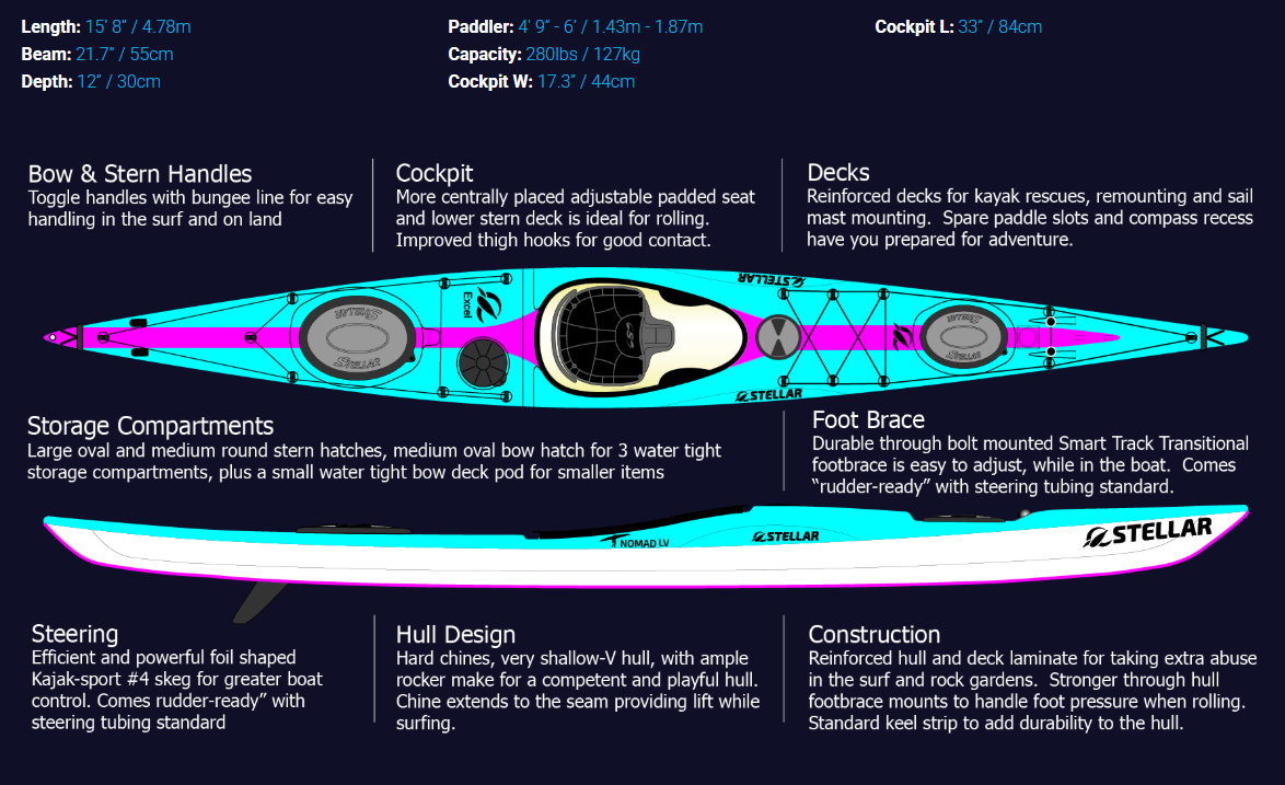The Nomad line is a sharp departure from our existing offering. We leaned into more traditional European designs with sharper, elongated chines and rocker for improved edging and carving. The Nomad LV is specifically designed for the smaller paddler, being shorter and narrower than the standard Nomad. You will find this smaller version will fit the smaller paddlers’ body and handle better for a lighter paddler too. This boat is both playful and stable in the surf and an excellent full featured expedition kayak. Recognizing the paddlers’ needs in this segment, the seat position is more central in the cockpit for comfortable back-deck rolling. The embedded compass mount, 3 bulkheads, stern-deck day hatch, stern-deck paddle recess for remounting and contoured spare paddle storage, will hit many buttons for the avid coastal Sea Kayaker. We’ve reinforced the decks and hulls for tougher usage in rescues, remounting and anchoring sail mounts as well as hull reinforcements for rock gardening. This skeg driven boat uses the innovative Kajak-Sport #4 skeg, with an optional over-stern rudder plumbing too.