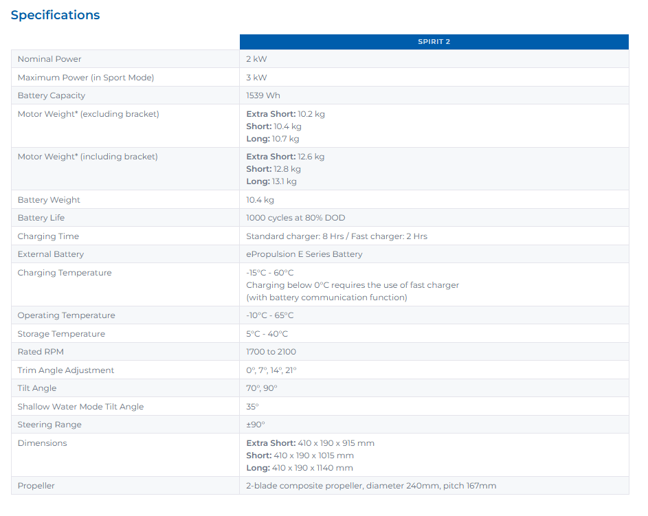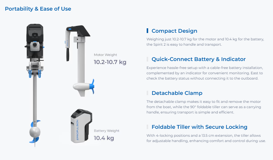 A decade of evolution has led to its fourth generation, ePropulsion expands the Spirit range to 2kW with the introduction of the new Spirit 2, a powerful battery-integrated electric outboard. This upgraded model delivers enhanced power while maintaining a similar compact size.