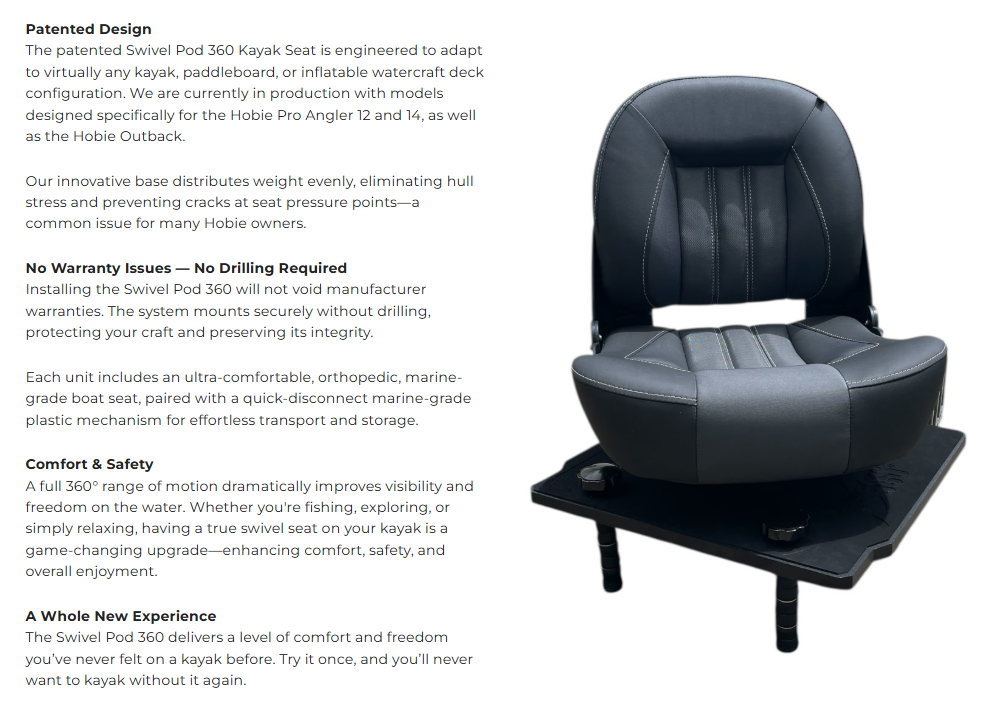 - The Swivel Pod 360 is equipped to hit all the marks of safety comfort, visual capability and fishing ability. its a whole new perspective on an already established kayaks such as the iconic duo of the Hobie Pro Angler and the Hobie Outback.